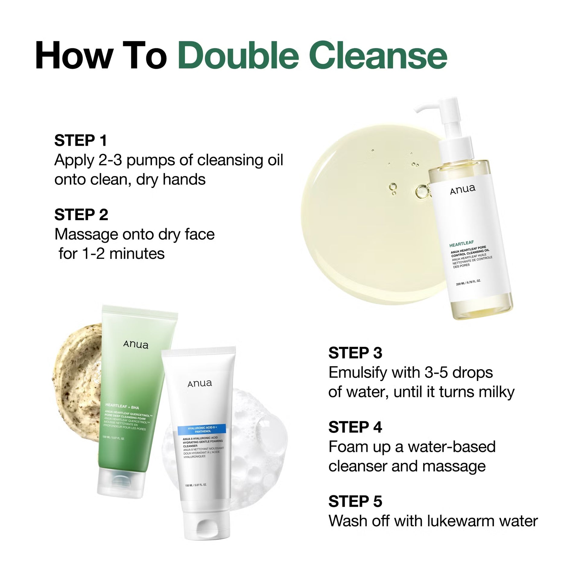 Breng 1 à 2 pompjes aan op een droge huid en masseer zachtjes in. Voeg water toe om de olie te laten emulgeren en spoel grondig af. Vervolg met een watergebaseerde cleanser.