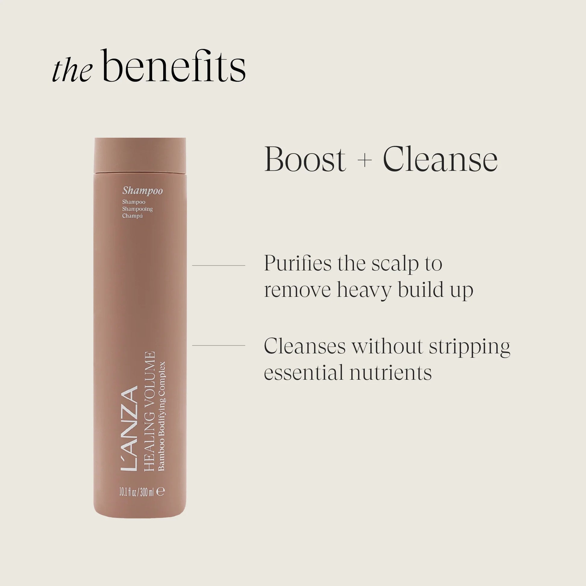 Breng aan op nat haar, masseer zacht in tot schuimvorming en spoel grondig uit. Voor optimale resultaten combineer met de Healing Volume Thickening Conditioner en andere producten uit de L’Anza Healing Volume-lijn.